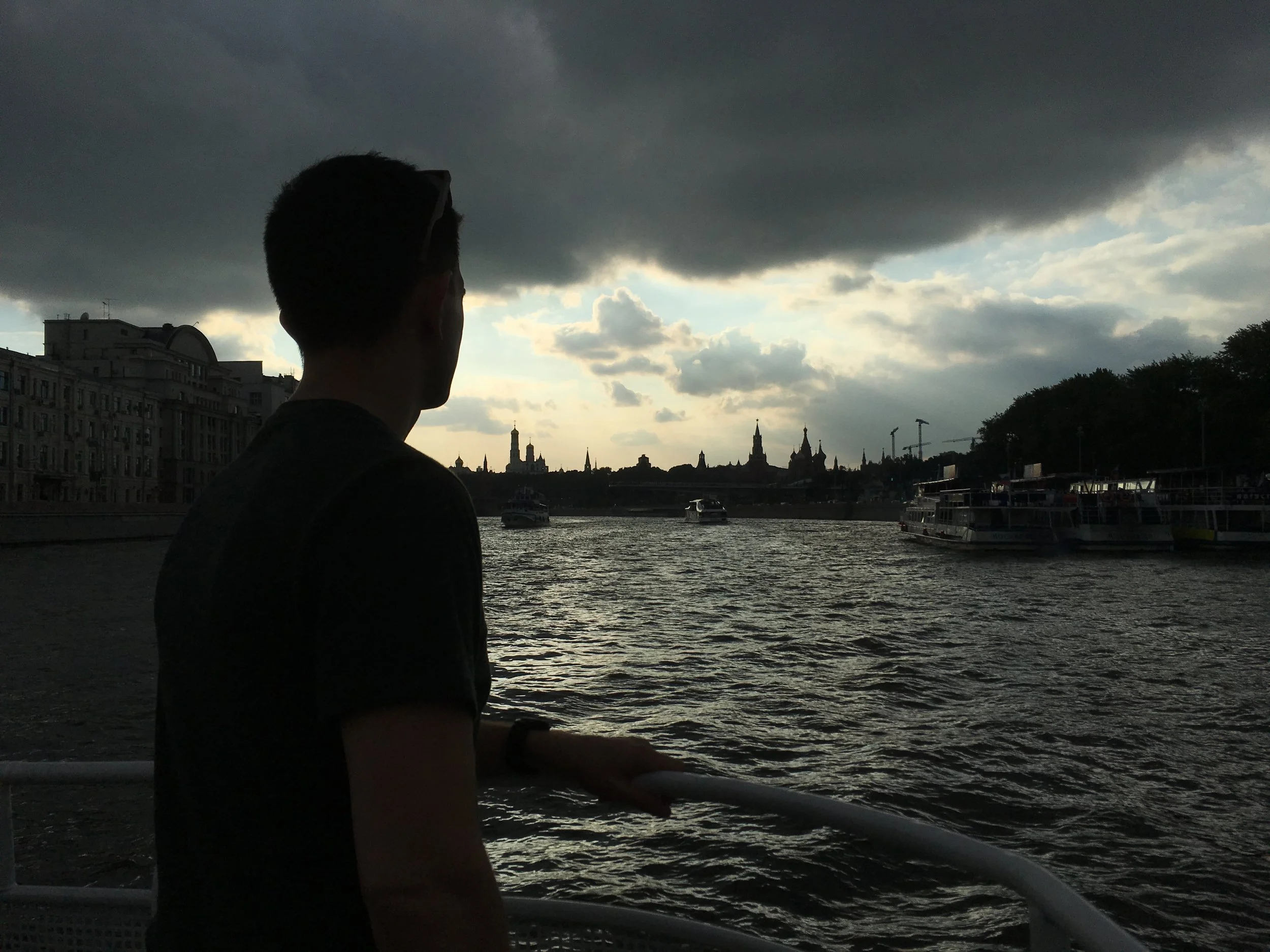 Thomas enjoying a view of the Kremlin and St Basil's Cathedral from our cruise